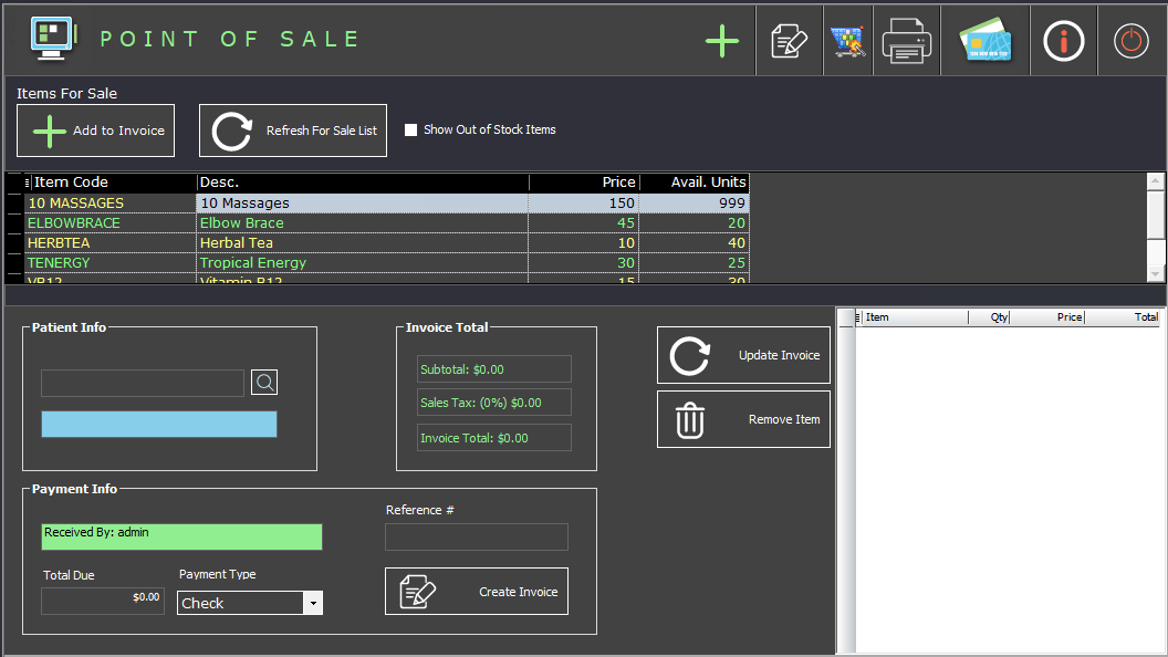 Inventory control and sales tracking system that allows you to record non-insurance billed inventory that your practice sells directly to patients. Tracks your inventory, reminds you when to reorder supplies, records patient sales, and creates invoices.